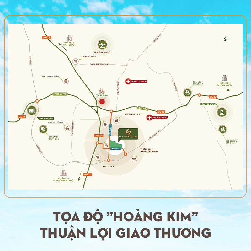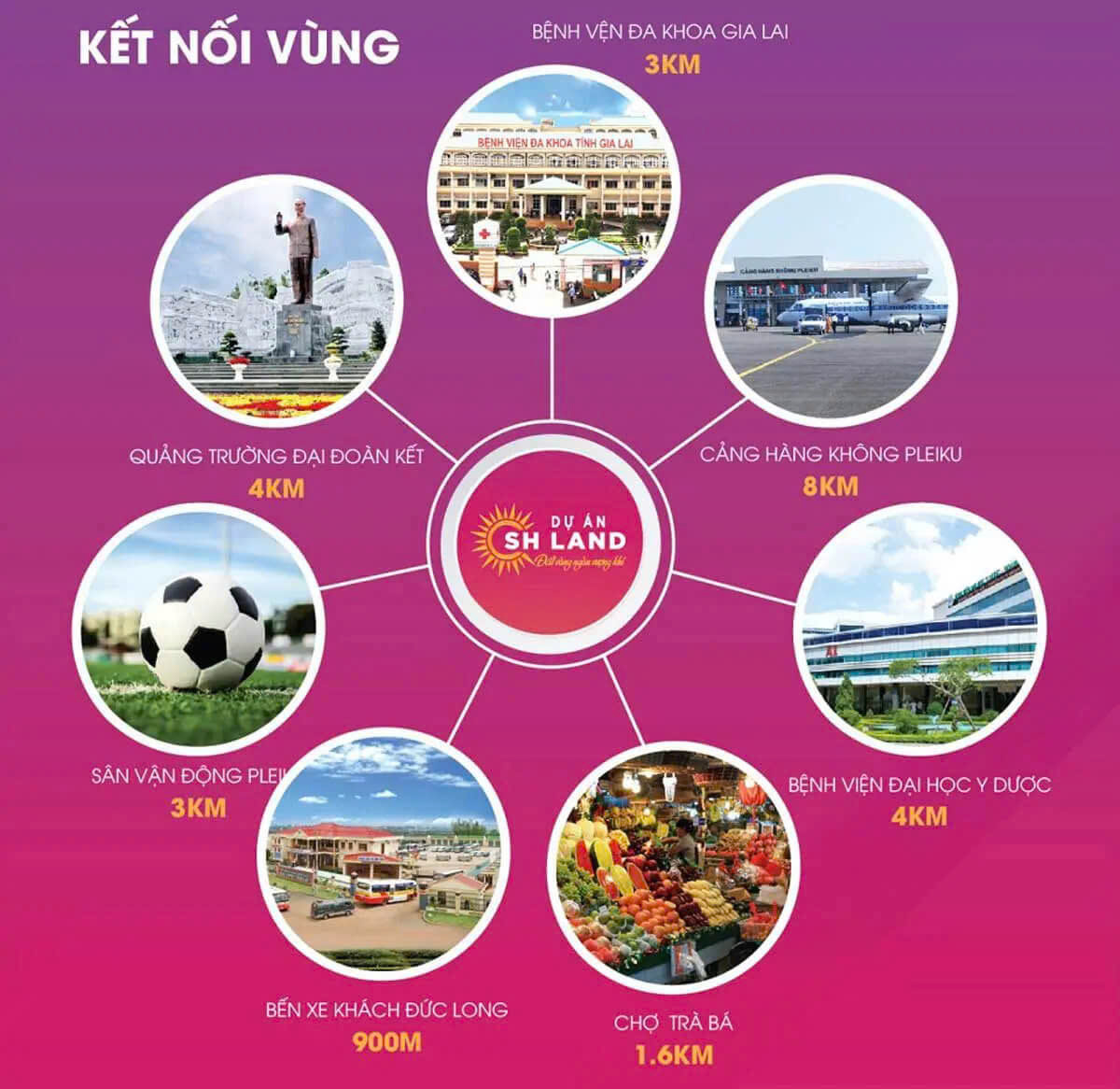 Cư dân SH Land Gia Lai có thể dễ dàng di chuyển lưu thông đến các điểm trọng yếu trong khu vực như: Khu mua sắm, trung tâm thương mại, khu vui chơi giải trí, sân bay Pleiku, bến xe Đức Long, bệnh viện đa khoa Tỉnh và trường học các cấp…